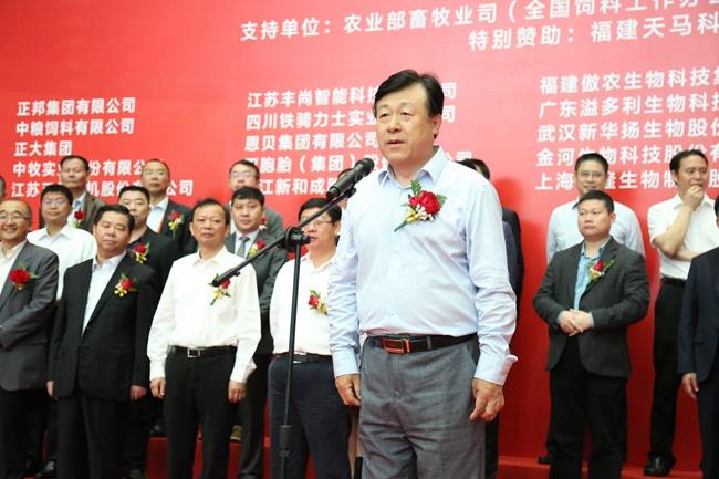 上图为全国畜牧总站站长、中国饲料工业协会秘书长杨振海主持展会开幕式