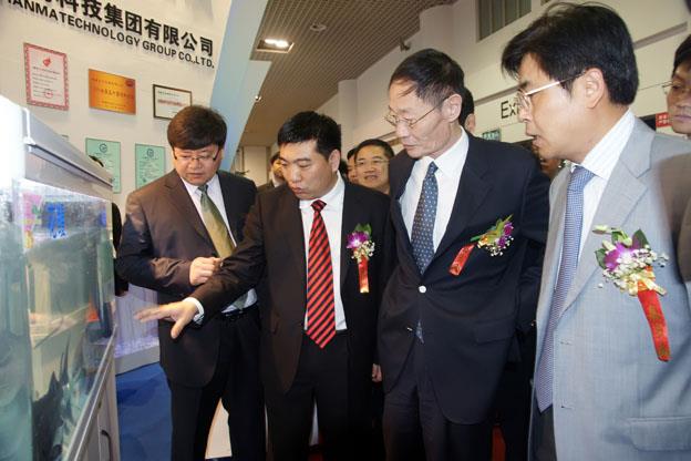 陈庆堂(左二)向农业部高鸿宾副部长介绍水产品及小兰电竞 ,助力你的电竞梦想,从入门到精通的相关配合饲料